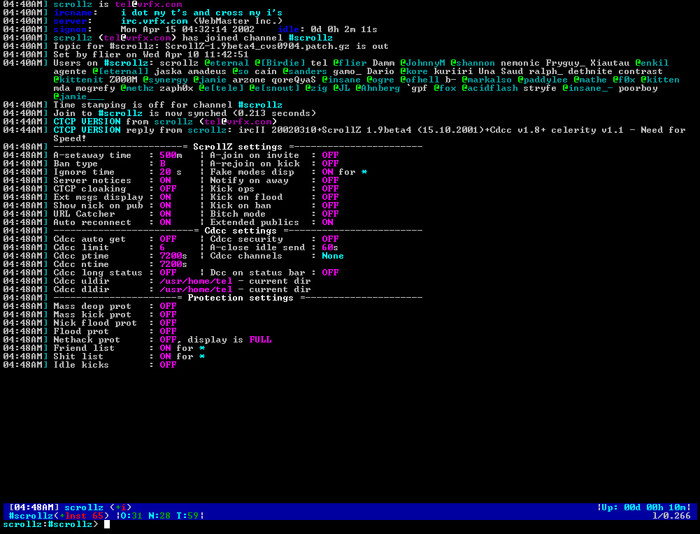 ScrollZ is an advanced IRC client based on ircII. It incorporates many useful features found in all sorts of scripts. The main difference between these scripts and ScrollZ is the code - whereas ircII scripts take a lot of disk and memory space and run slow, ScrollZ only takes a couple of extra kilobytes compared to stock ircII client yet runs faster than any ircII script. This was accomplished by using C code instead of ircII scripting language. This reduces memory and CPU usage and code tends to run way faster.